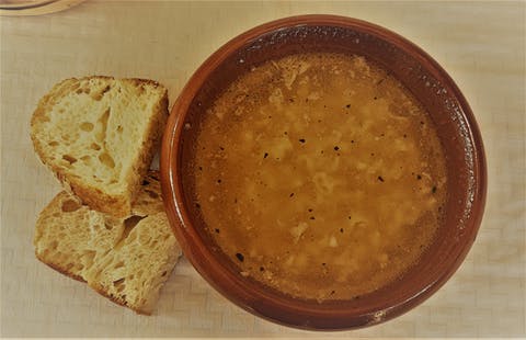 and vegetarian cracklings. The soup is served in an old-fashioned soup bowl the
