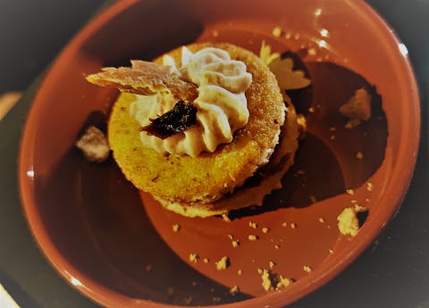 plum jam in the middle. Topped with plum mousse, buckwheat biscuit, pear crumbs,